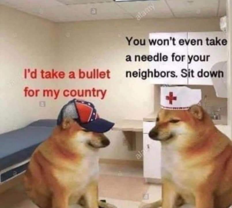 I like everyone one on one, but I despise humanity as a whole, a paradox, lol. I can't believe something like a vaccine could become a political issue. I believe in freedom of choice, but the whole anti- vaccine thing is looney tune shit to me. Get it or don't, but people message me all the time with anti vaxxer shit, gimme a break.