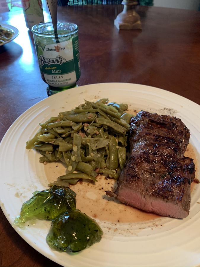 Grilled blackstrap of lamb with mint jelly and garden fresh green beans.