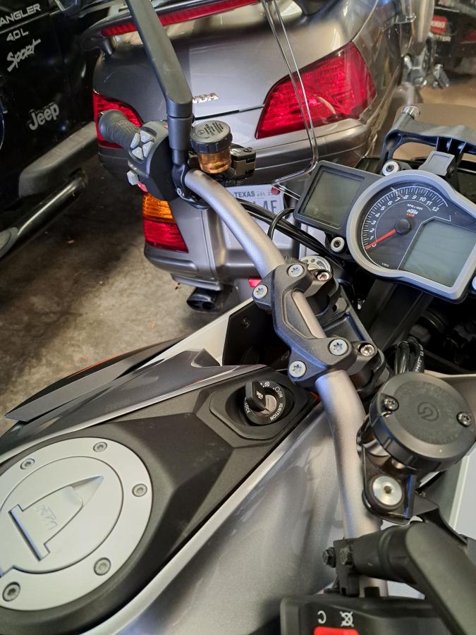 Installed a set of AfterMokit handlebar risers this morning, an inch up and an inch back. I like how they sit down in the stock handlebar riser saddle where they won't turn. Had plenty of slack in the cables, hoses, and wiring looms. They gave me a pretty relaxed riding position removing weight from arms.